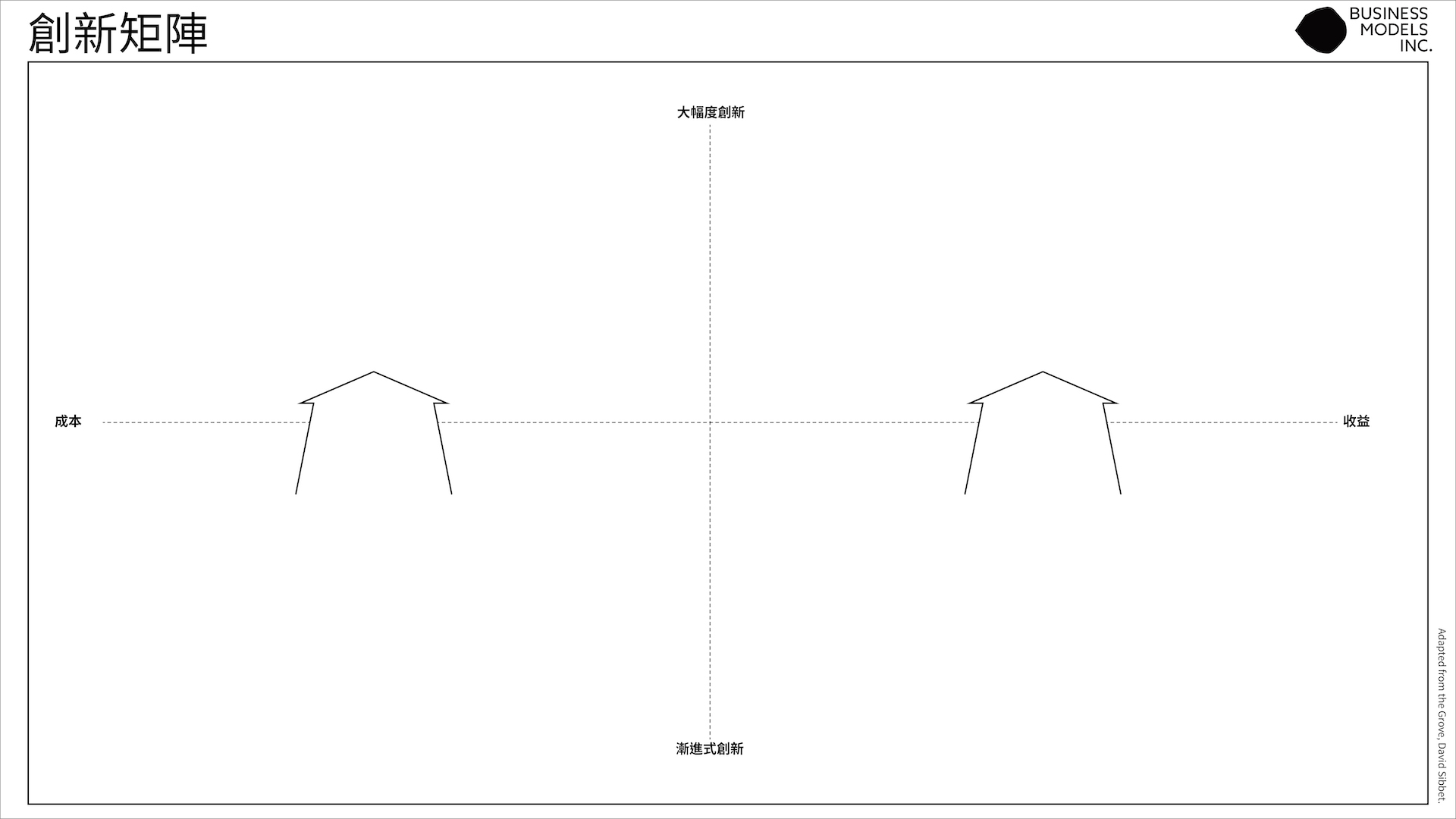 創新矩陣的垂直軸代表的是從漸進式創新到大幅度創新,水平軸則代表降低成本及增加收益。當然,你也可以自行定義垂直軸和水平軸的決策標準。無論你使用何種標準,都得確保他們要有清楚、明確的區分性,如此才能幫助你整理,並能從中挑選一些點子來製作原型及驗證。