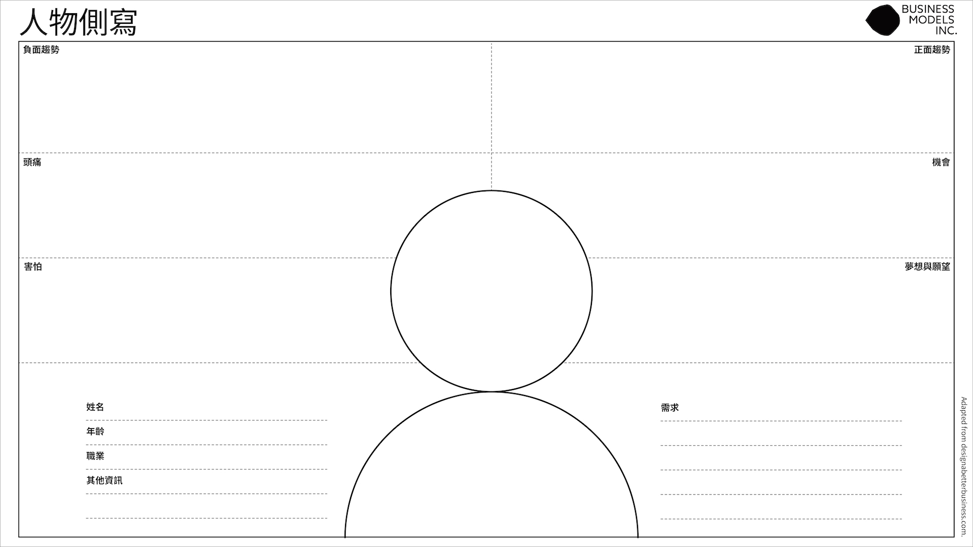 如果你曾從事設計,或與設計師一起工作過,很可能已經看過他們為了掌握客群/使用者,而做出來的各種人物側寫。這個工具圖可以讓你勾勒出使用者樣貌。