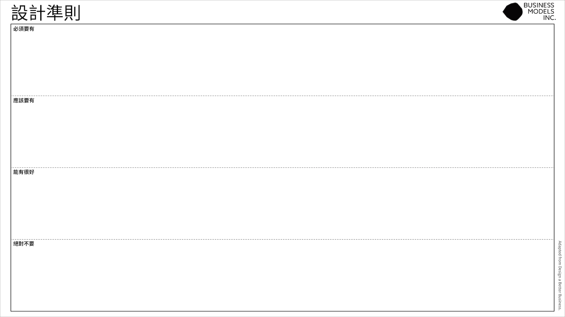 別只把這些準則當作你的點子所具備的一些特徵而已,它的作用遠大於此。比方說,「你的生意必須兼具環保」就可能是源自願景的設計準則;又比如說,你希望顧客能夠開心可能是另一個設計準則;你的新生意構想要能在三年內獲利達到某個金額嗎?這個可能也是一種。簡單來說,設計準則的存在,可以讓你輕鬆判斷自己是不是在對的方向。
